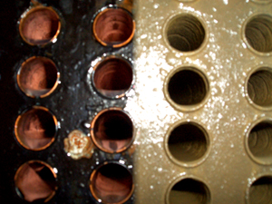 2.減少了循環(huán)水量 沉積物或生物粘泥覆蓋在換熱器,冷凝器、蒸發(fā)器中的金屬表面時,使循環(huán)水通道的截面積和通量變小,循環(huán)壓力升高,進一步增加電能消耗,使換熱效果降低。